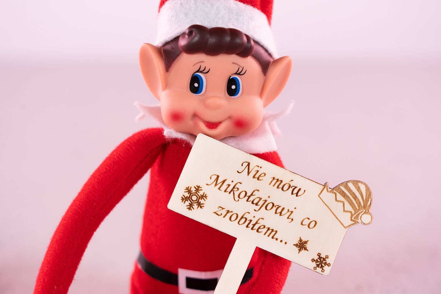 Psotny elf może dumnie trzymać tabliczkę z napisem „Zrobiłem bałagan!” lub „Czas na psoty!”.